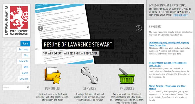 Lawrence Stewart dot Ca is a custom built WordPress theme by Lawrence Stewart. Although the theme is not currently available, this may change as time passes. Lawrence Stewart dot Ca was built as a Portfolio, Blog, and CMS, to showcase work and anything exciting and interesting the author finds.